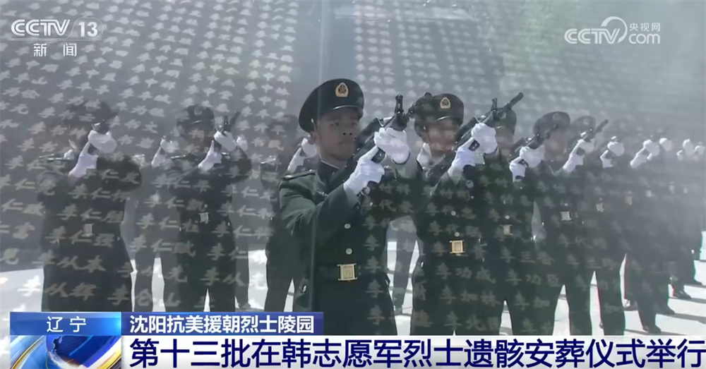 央视网消息:4月23日上午,第十三批在韩中国人民志愿军烈士遗骸安葬仪式在沈阳抗美援朝烈士陵园举行,12位志愿军英烈回到中华大地安息。仪式现场,礼兵护送志愿军烈士棺椁缓缓步入纪念广场。全体人员向志愿军烈士三鞠躬。礼兵鸣枪,以鸣枪礼的最高礼节,向英烈致以崇高的敬意。随后,礼兵们抬起志愿军烈士遗骸棺椁,绕广场半周,缓缓走向安葬地宫。全体人员凝视着烈士棺椁,送别英烈。